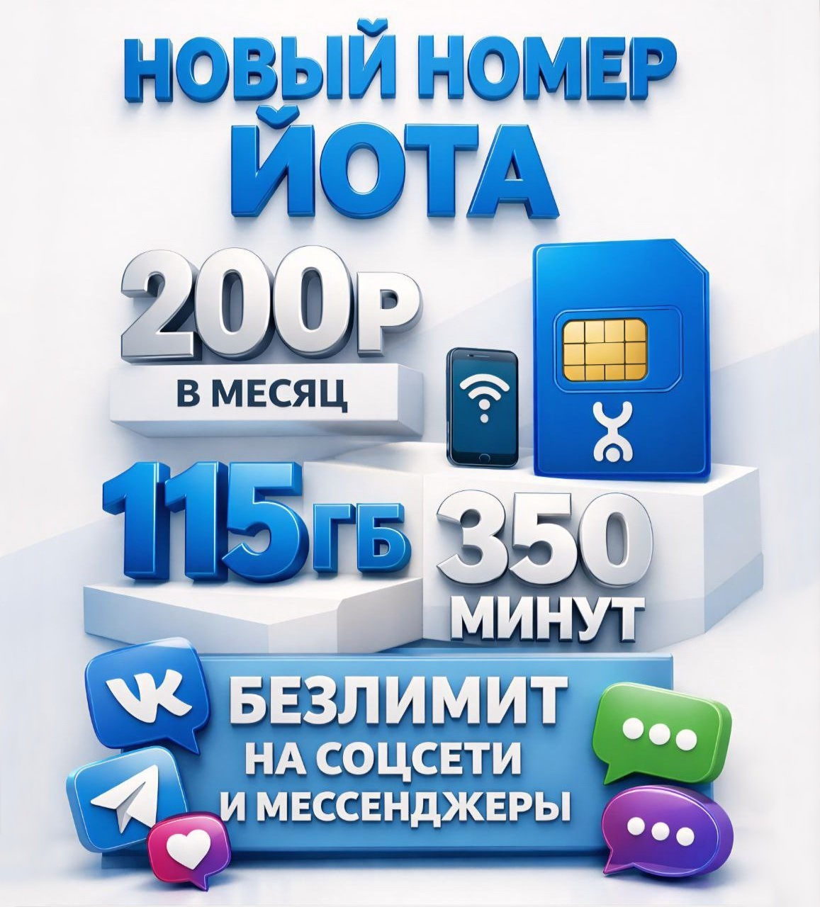 Новая сим-карта Переход от др. оператора 💳 200р/мес 📞 350 минут 🌐 115 Гб 🛜 Бесплатная Wi-Fi раздача интернет 🛜 Безлимитный трафик на соцсети и мессенджеры 💻 Работает в любом устройстве 📦 Получение в офисе Йота