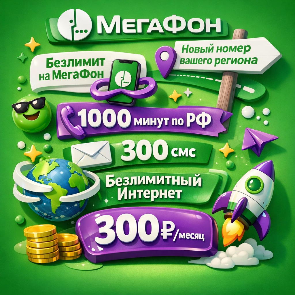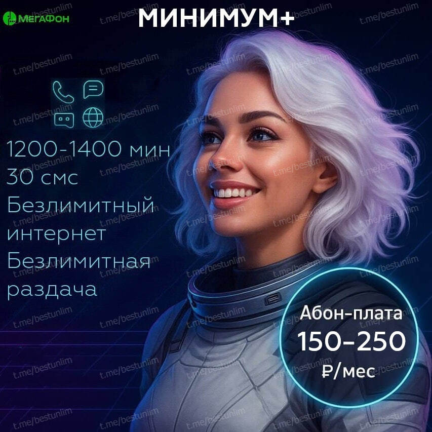Подключение на ваш номер Мегафон 📞 1200-1400 минут ✉️ 30 SMS 📞 Безлимитные звонки на Мегафон РФ 🌐 Безлимитный интернет 📡 Безлимитная раздача интернета 🗳 Перенос остатков пакетов 💳 150-250р/мес