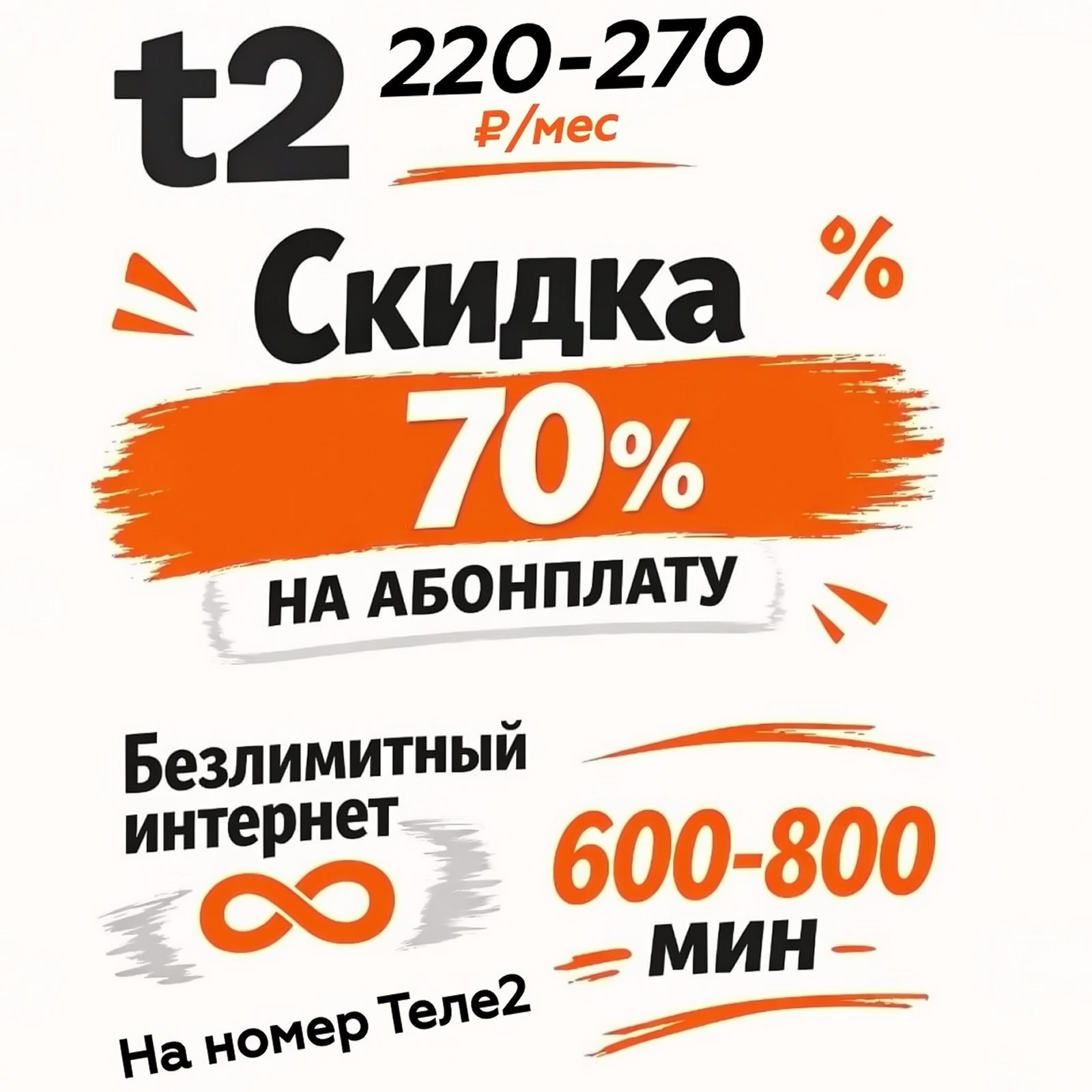 Подключение на ваш номер Теле2 тарифа Мой Онлайн+ с скидкой на АП 70% 💳 220-270р/месяц 📞 600-800 минут 🌐 Безлимитный интернет