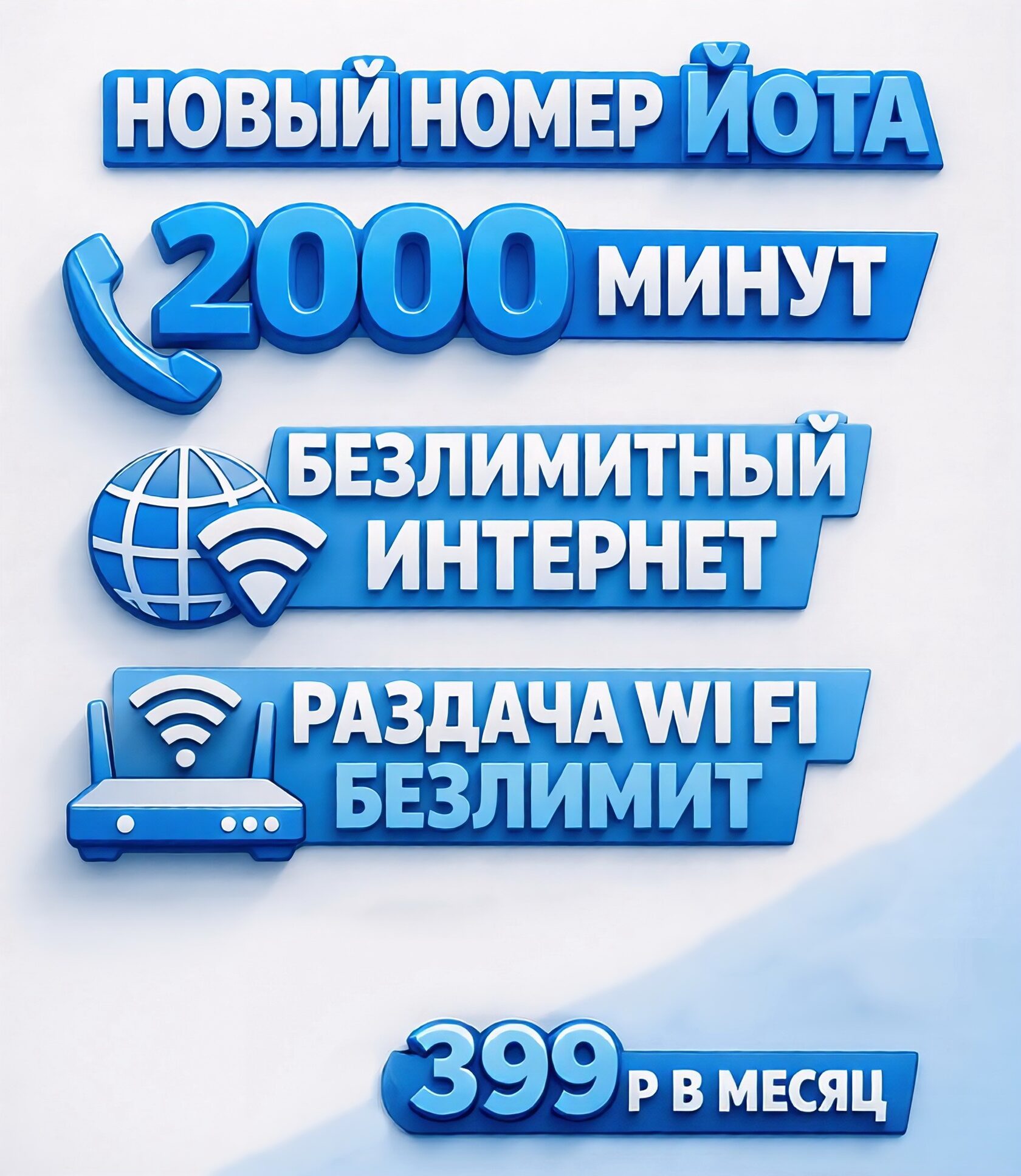 Новая сим-карта 💳 399 р/мес 🌐 Безлимитный интернет 🛜 Бесплатная Wi-Fi раздача интернет 📞 2000 минут 📦 Получение в офисе Мегафон или Йота