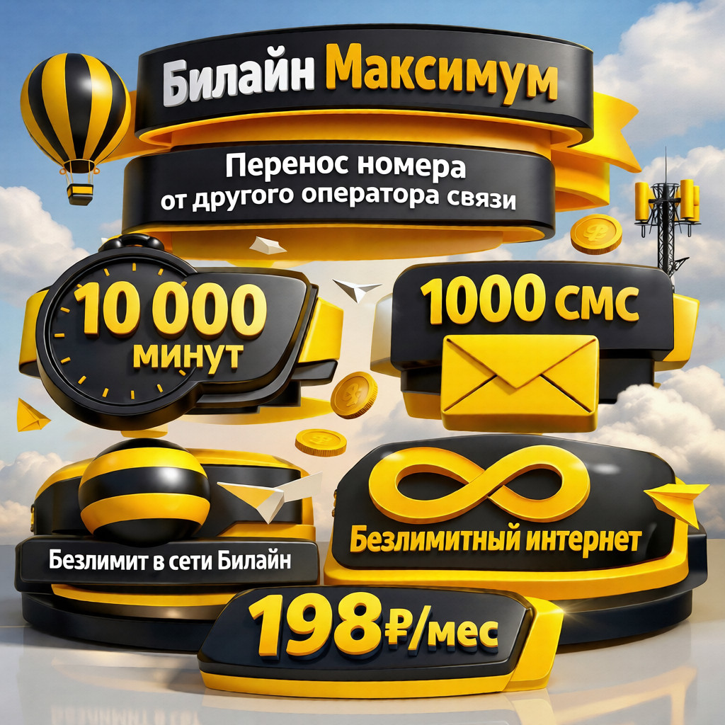 📲Переход от другого оператора 💳 198 р/мес 📞 10000 минут 📞 Безлимит. звонки на Билайн (не тратят пакет минут) 🌐 Безлимитный интернет 🛜 Wi-Fi раздача интернета 📨 1 миллион смс 📦 Получение в офисе Билайн